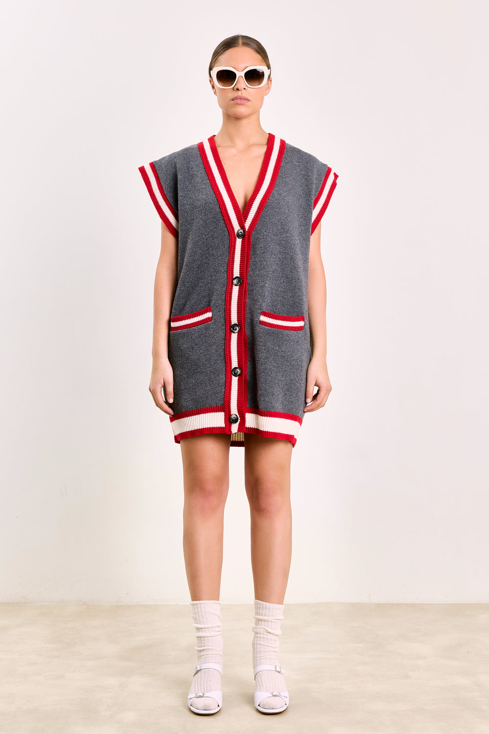 This knitted sleeveless dress blends the ease of a throw-on layer with the attitude of a standout statement. The oversized fit and deep V-neck give it a laid-back cool, while the striped trims and bold buttons nod to a classic college look. Wear it solo with loafers and chunky socks, or layered over a crisp shirt. A piece that plays by its own rules, and wins every time. Available in Dark Grey & Brown.