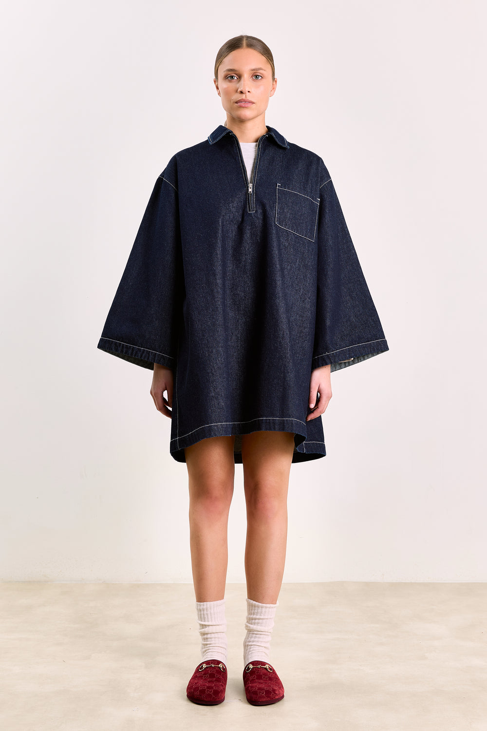 This rinse denim dress is a modern, easy-to-wear piece with a relaxed A-line silhouette. Its half-zip closure and boxy, wide sleeves add a subtle utilitarian edge, while the dark indigo wash keeps it polished and versatile. Wear it solo with loafers or boots for a minimalist look, or layer over a turtleneck and tights when temperatures drop. The drop shoulder and loose fit make it perfect for effortless, everyday dressing, while still offering room for creative styling.
