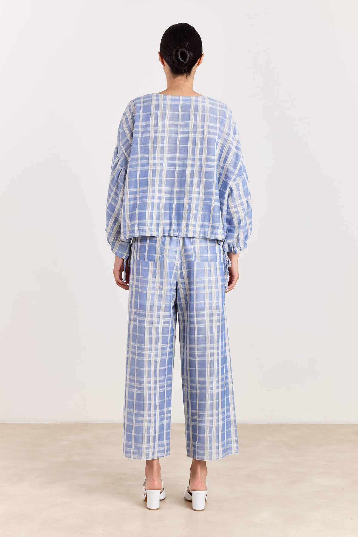 Gaby is defined by graphic checks and a loose, flowing shape. Sleeve ties add subtle definition, while the pattern gives the piece its character. Confident and complete on its own. Style it as a set with the Sienna trousers, or break it up with the Magali jeans skirt for a more relaxed look.
