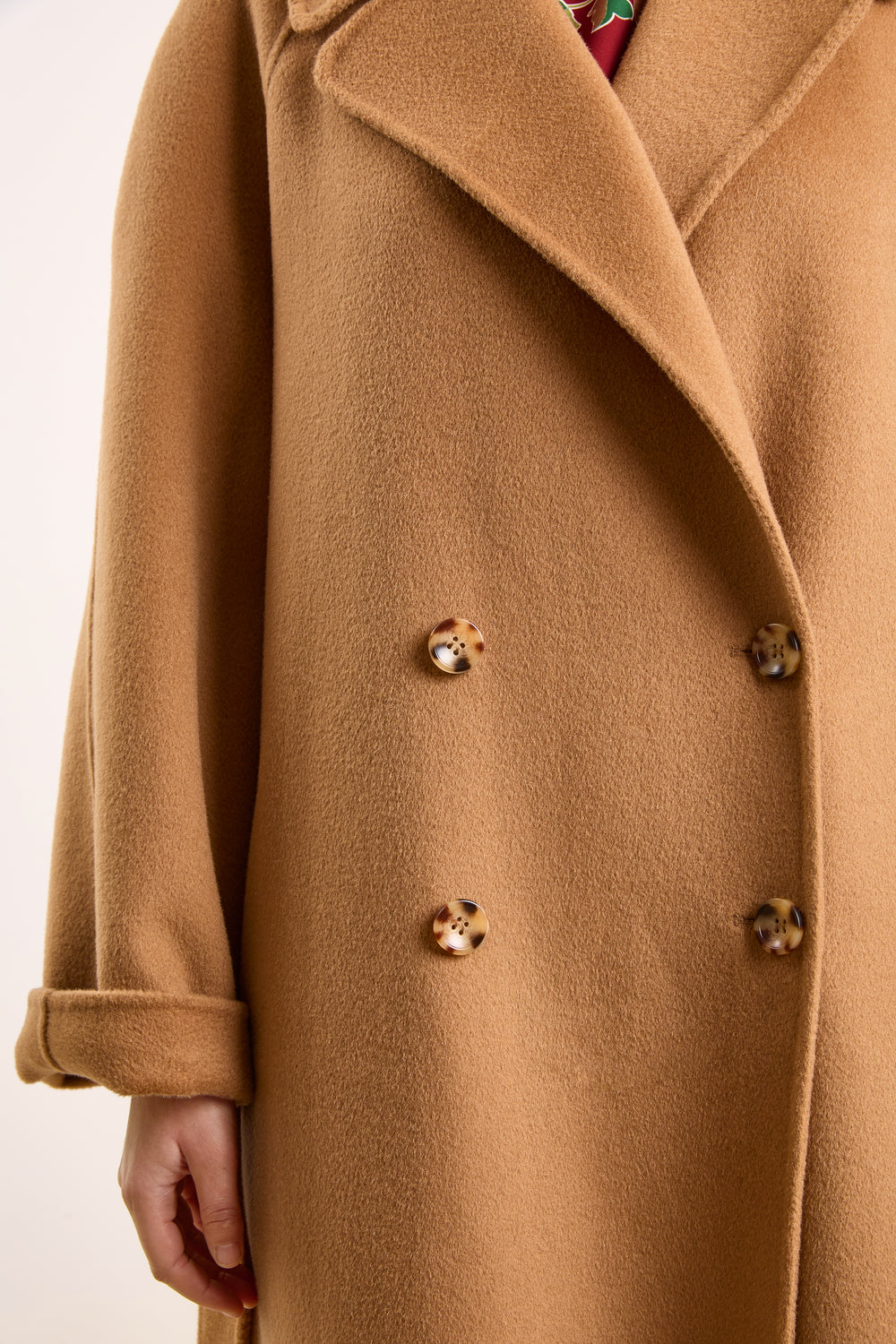 This long double-breasted coat is made from a luxuriously soft boiled wool in a rich whiskey camel color. It has a wide notched collar, dropped shoulders, and long sleeves with turned-up cuffs. The length falls to the ankles for maximum coverage, and the back features a self-tie belt that can be worn loose or tied for shape. One size.
