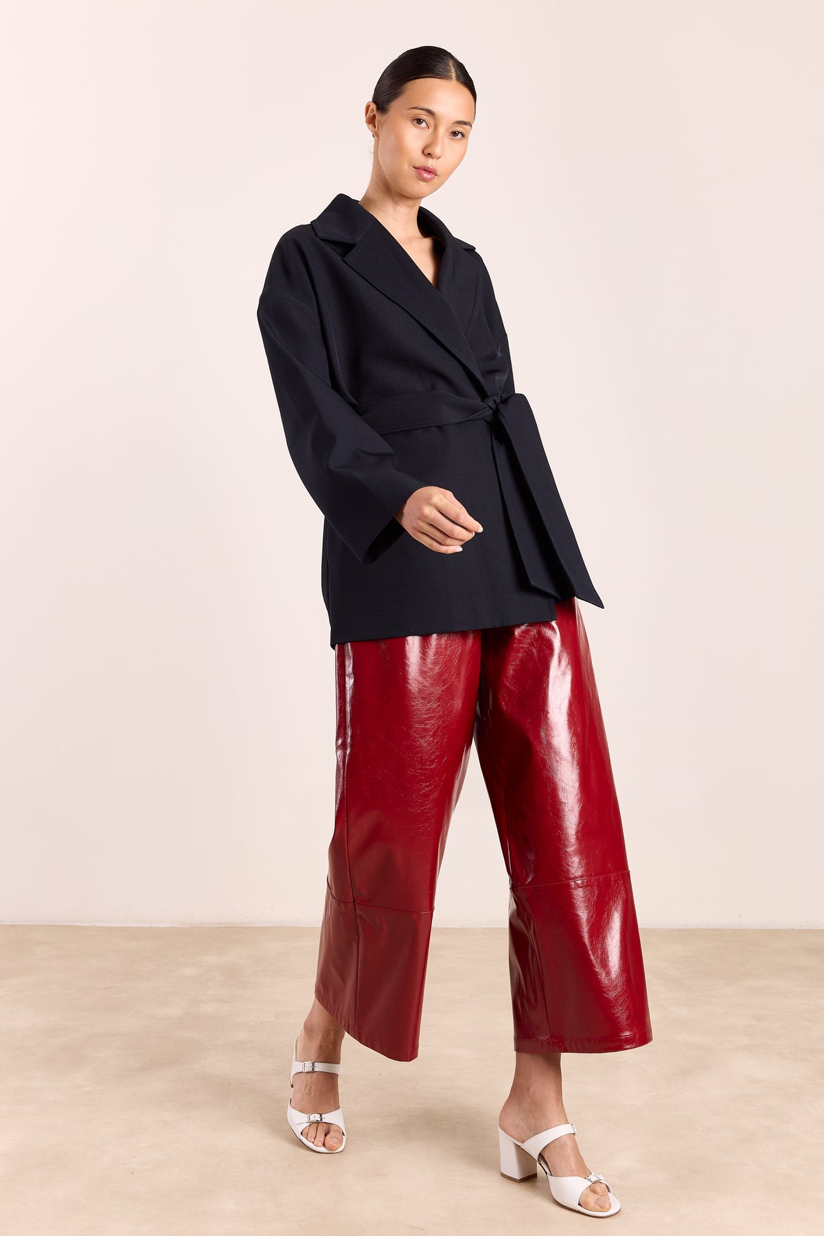 Tailoring, but make it cool. This navy kimono jacket brings edge to classic structure: oversized sleeves, clean lapels, and a belt that lets you play with proportion. It’s the kind of piece that works just as well thrown over wide-leg pants as it does layered on a pencil skirt. Minimalist, confident, and made for the now.