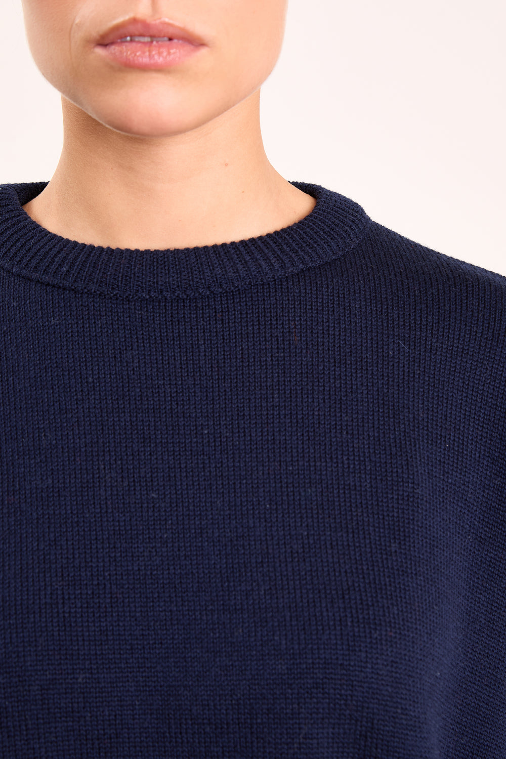 Loua is knitted from a high-end merino wool yarn. Designed with a classic crew neckline, dropped shoulders, and long sleeves finished with fine ribbed cuffs. The hemline features wide ribbing with small side slits for ease of movement and layering. Has an oversized fit. Model is 175cm and wears size XS/S.