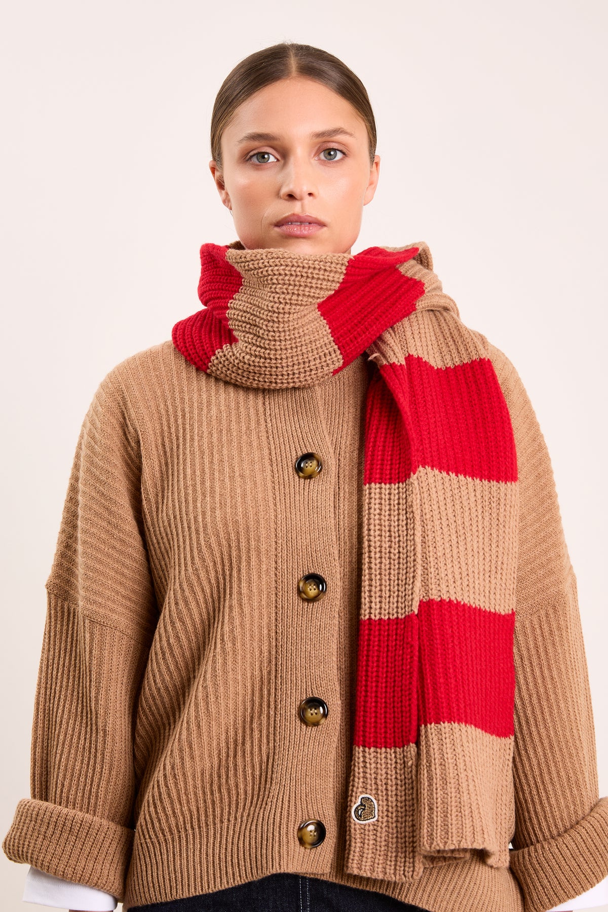 Wrap it up - with attitude. This chunky knit scarf brings a bold pop of color to your cold-weather lineup. With its oversized stripes, it's equal parts cozy and cool. Whether draped, knotted, or tossed over your shoulder like you totally didn’t try, this scarf definitely is a styling choice (and it will keep you warm as well...). Available in Off White/Brown, Camel/Red & Light Grey.