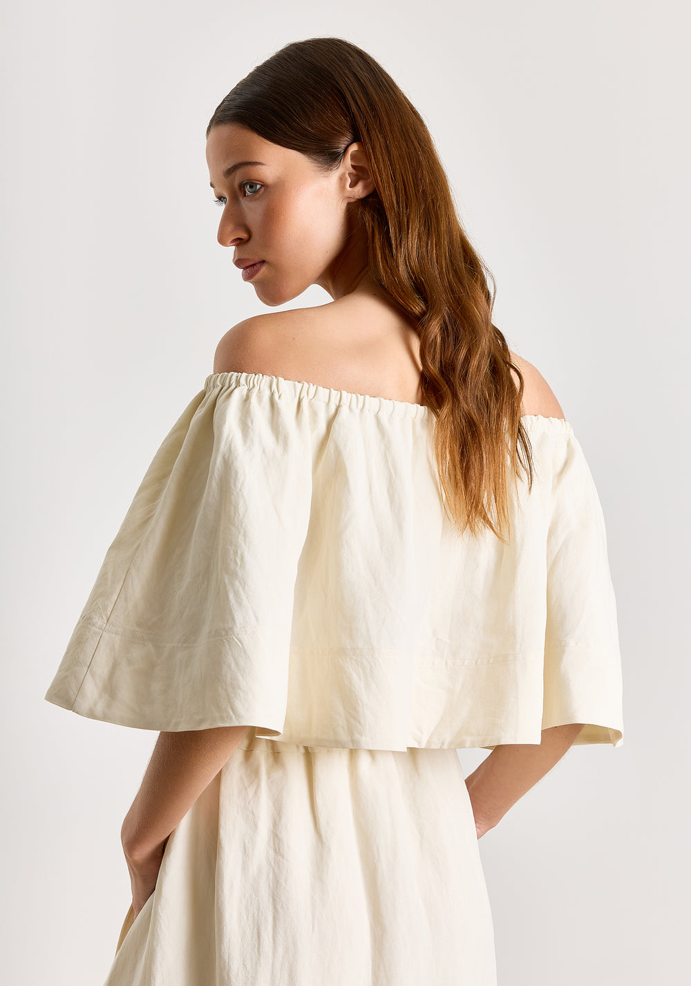 Gaëlle is cut from a viscose-linen blend fabric that feels very light and crispy. This sleeveless blouse features an off-the-shoulder neckline with wide ruffle. Available in off white and brown. Model is 178 cm and wears size XS/S.