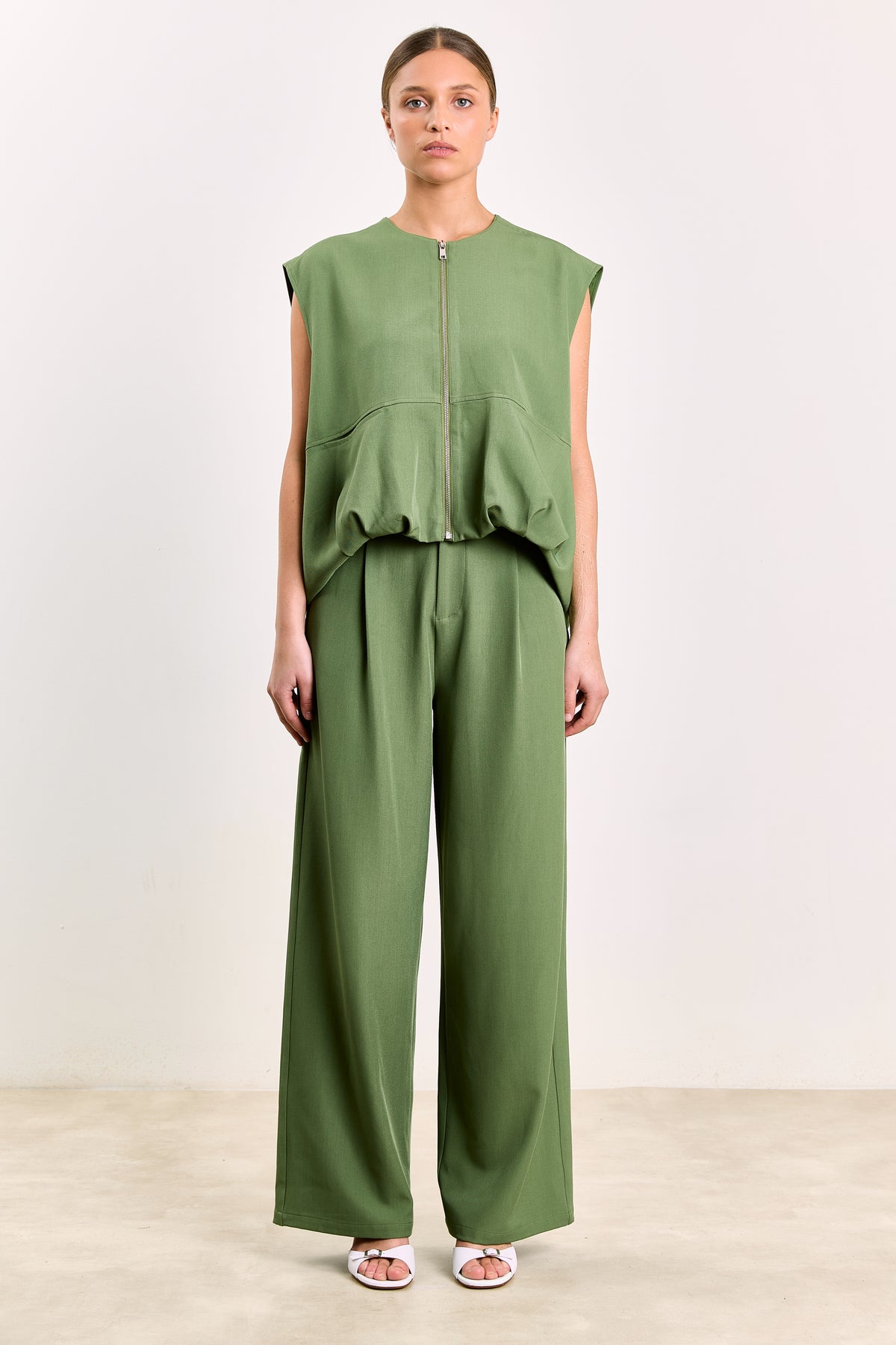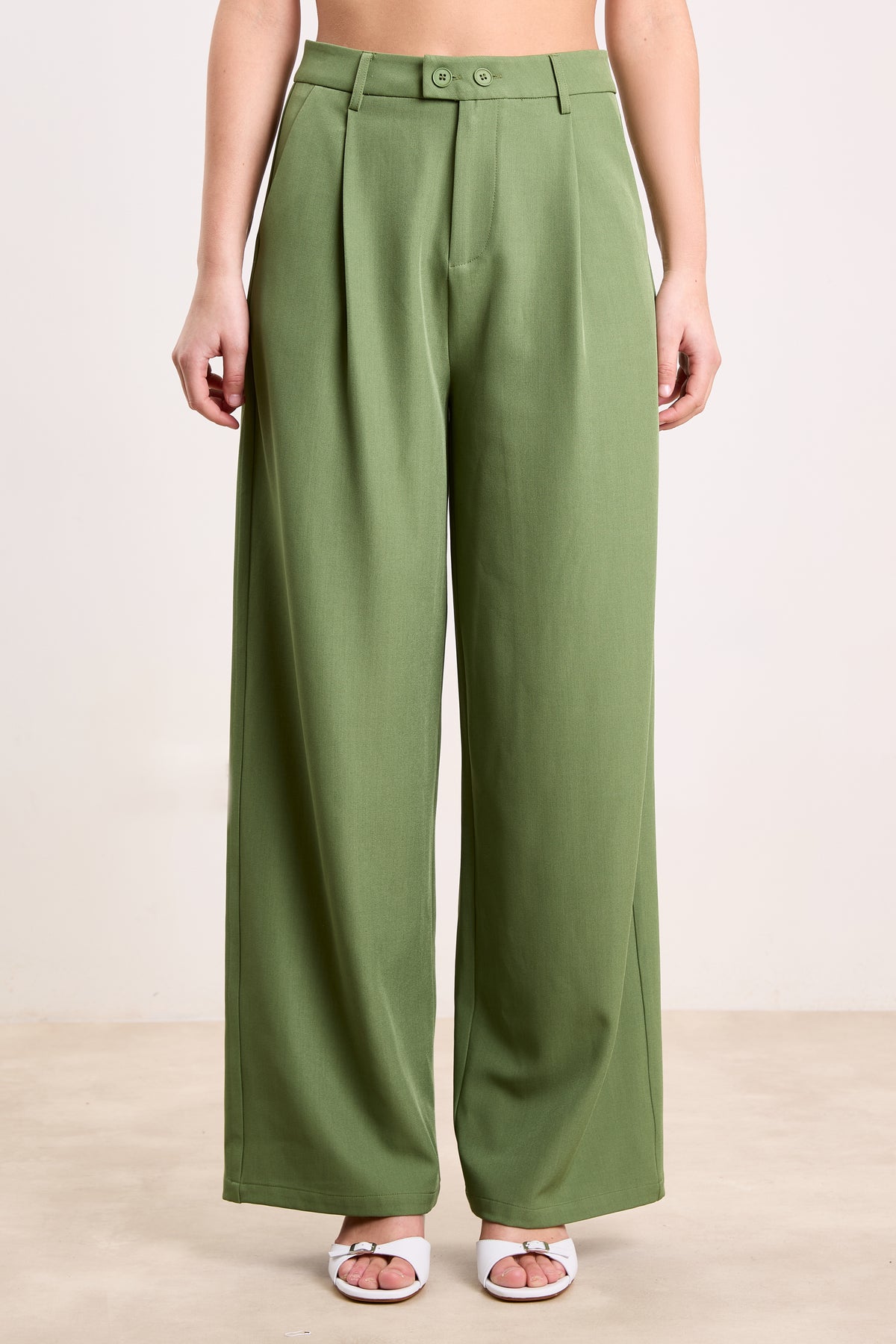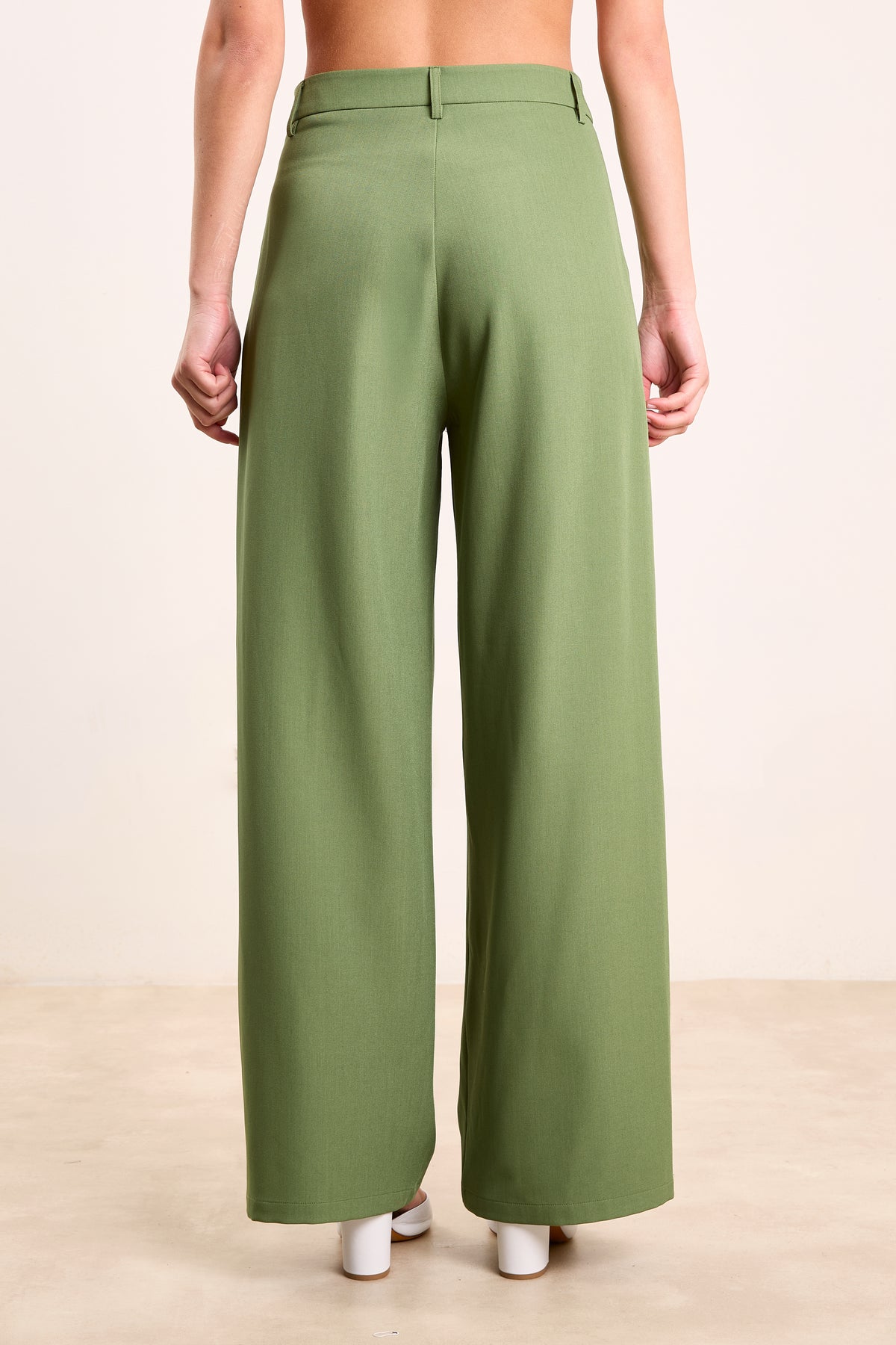 Tailored from a structured yet fluid fabric, these high-waisted pants feature a wide-leg cut, double-button waistband, and subtle front pleats. Style them up or down—they’re as versatile as your calendar. Model is 175cm and wears size 36.