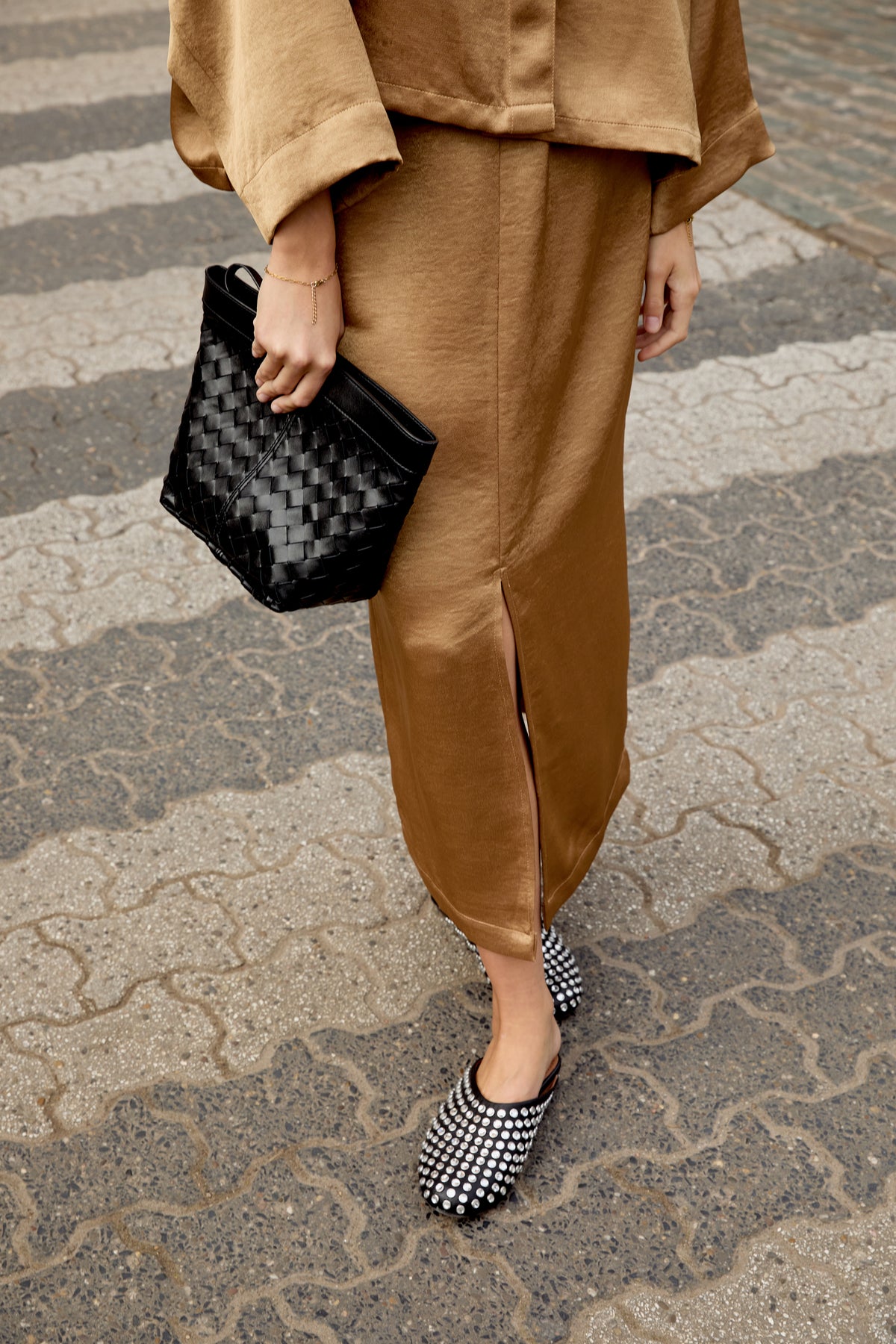 Endlessly versatile: this satin midi skirt moves seamlessly from day to night. For the office, pair it with our Yannick blouse or a fine knit (such as Steffi), finishing with loafers or heels for a polished look. On weekends, opt for an oversized sweater and sneakers for laid-back ease. The satin-look of the fabric acts as a perfect canvas for textural contrasts - think chunky knits or crisp cotton shirts. Available in Caramel, Dark Olive and Steel Grey.